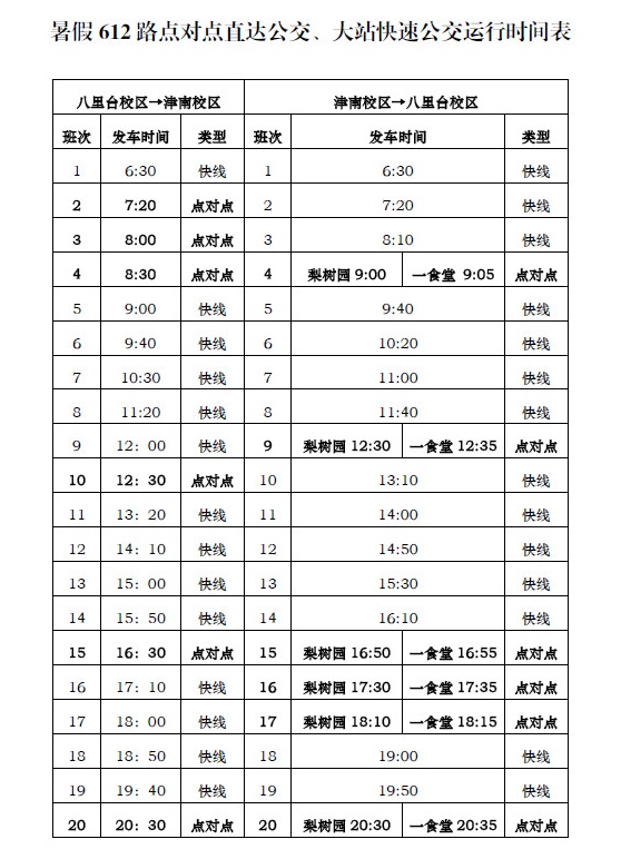 7月1日—8月23日(含周六、日及法定节假日)实行暑假运行方案。在612路点对点直达公交和大站快速公交运行间隙,根据实际需求安排普线公交;暑假期间,点对点直达公交、大站快速公交、普线公交运行线路及停靠站点不变;津南校区225路校园公交停运。