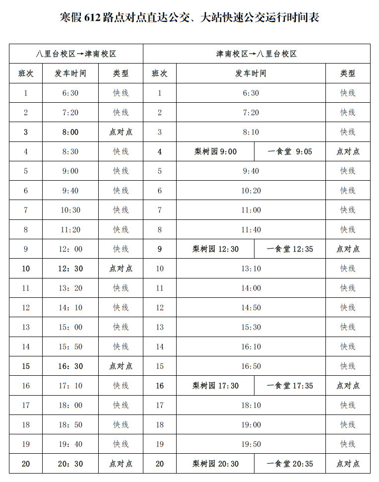 为满足寒假期间津南校区值班人员及留校师生的出行需求,进一步做好交通通勤服务保障,接待服务中心积极与天津公交集团二公司进行协商,决定自2020年1月14日—2月14日(含周六、日及法定节假日)实行寒假运行方案,具体安排如下: