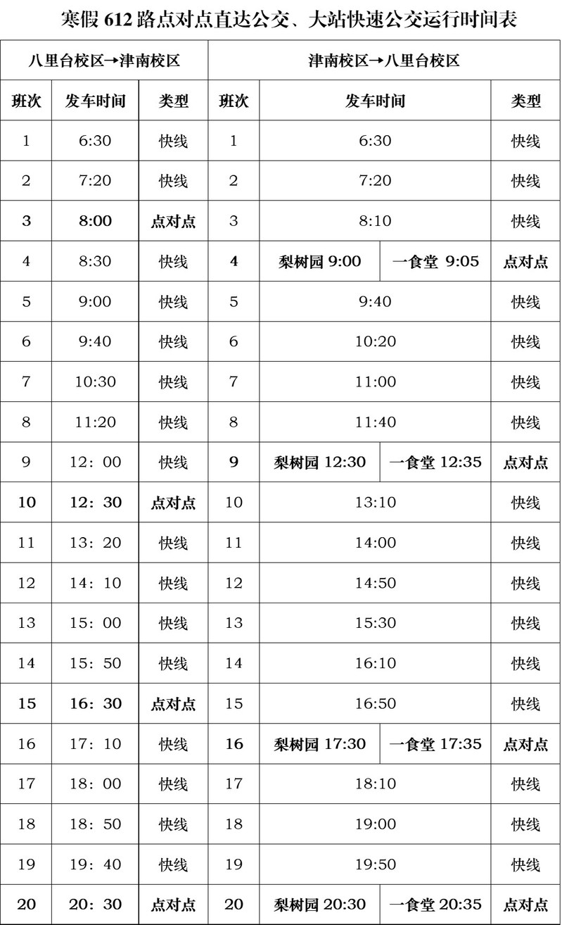 1月27日至2月19日实行寒假运行方案,在612路点对点直达公交和大站快速公交运行间隙,根据实际需求安排普线公交;公交运行线路及停靠站点不变;2月20日公交恢复正常运行模式,其中2月20日、21日(周六、日)按工作日方案运行。