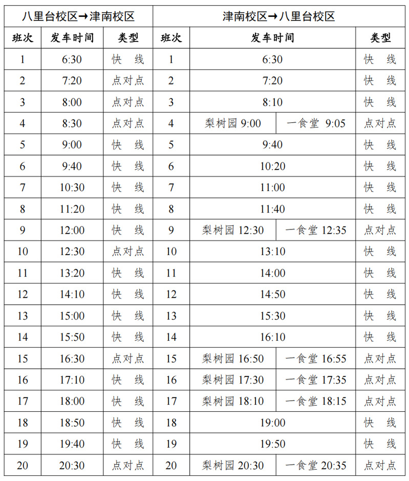 7月1日(周二)至9月4日(周四),泰达校区与八里台校区、津南校区班车按照假期班车方案运行,9月5日(周五)恢复正常工作日运行。如遇临时调整,另行通知。