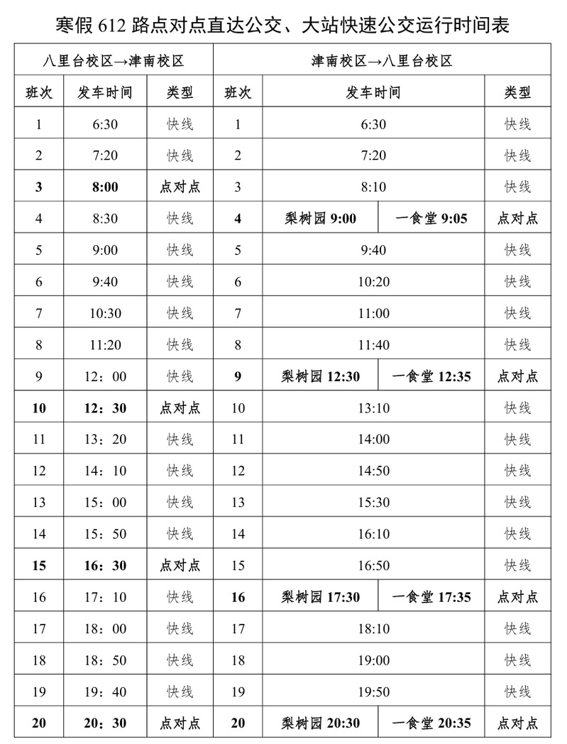 1月27日(周二)至2月28日(周六),泰达校区与八里台校区、津南校区班车按照假期班车方案运行,其中2月15日至2月23日(腊月二十八至正月初七)停运。如遇临时调整,另行通知。