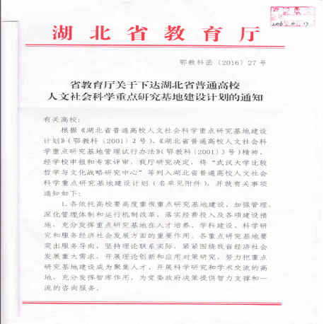 在国家和省、市领导的领导亲切关怀下,在学校大力支持下,武当文化中心成立以来,进入快速发展轨道。基地加强内部建设和规范运行,按照省社科基地建设要求与基地规划,切实推进中心发展。以科学研究为核心,在深挖和做大武当文化方面下功夫,基础研究与应用研究同步发力,纵向横向并重,不断提高基地科研水平和学术声誉。重视教育教学,多种形式宣传武当文化,弘扬中华优秀传统文化,培育社会主义核心价值观。加强咨政服务,积极参与政府决策咨询、项目调研、专题报告,响应政府需求,彰显地方智库功能。