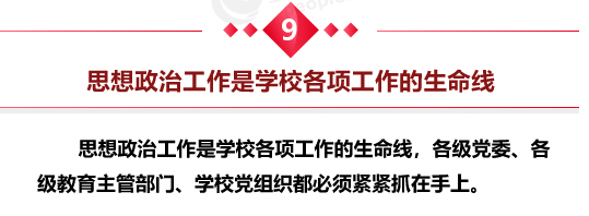习近平强调,加强党对教育工作的全面领导,是办好教育的根本保证。教育部门和各级各类学校的党组织要增强“四个意识”、坚定“四个自信”,坚定不移维护党中央权威和集中统一领导,自觉在政治立场、政治方向、政治原则、政治道路上同党中央保持高度一致。各级党委要把教育改革发展纳入议事日程,党政主要负责同志要熟悉教育、关心教育、研究教育。各级各类学校党组织要把抓好学校党建工作作为办学治校的基本功,把党的教育方针全面贯彻到学校工作各方面。思想政治工作是学校各项工作的生命线,各级党委、各级教育主管部门、学校党组织都必须紧紧抓在手上。要精心培养和组织一支会做思想政治工作的政工队伍,把思想政治工作做在日常、做到个人。