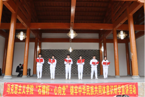 主题党日活动结束后,马克思学院师生党员先后赴坎子山周边、湖北关调研学习,感受美丽乡村建设,感悟伟大革命精神,然后在湖北口回族乡红色文化广场参加铸牢中华民族共同体主题文艺演出,vwin德赢ac米兰官方网学生党员为当地群众表演诗朗诵《籽籽相连石榴红,红心向党复兴梦》,赢得了台下群众的热烈掌声。