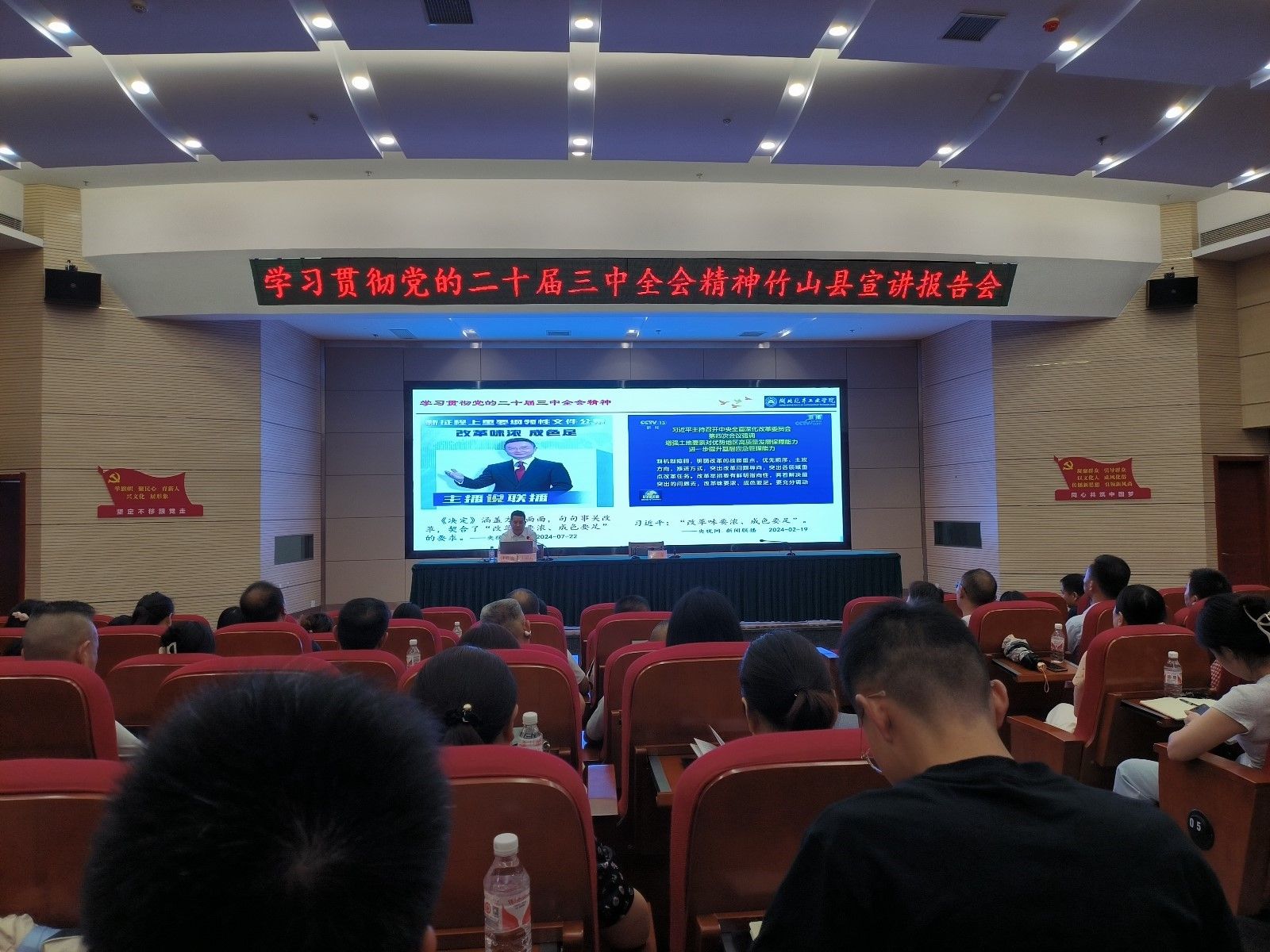 在竹山县新时代文明实践中心会场,vwin德赢ac米兰官方网分党委书记计毅波教授以《以进一步全面深化改革开辟中国式现代化广阔前景》为主题,从全会的基本情况和主要成果、深刻认识党的二十届三中全会的重大意义和总体要求、准确把握重要改革部署和举措、提升党的领导水平和认真学习贯彻落实全会精神五个方面,对党的二十届三中全会精神进行了深入论述,县直单位100余名干部职工参会。
