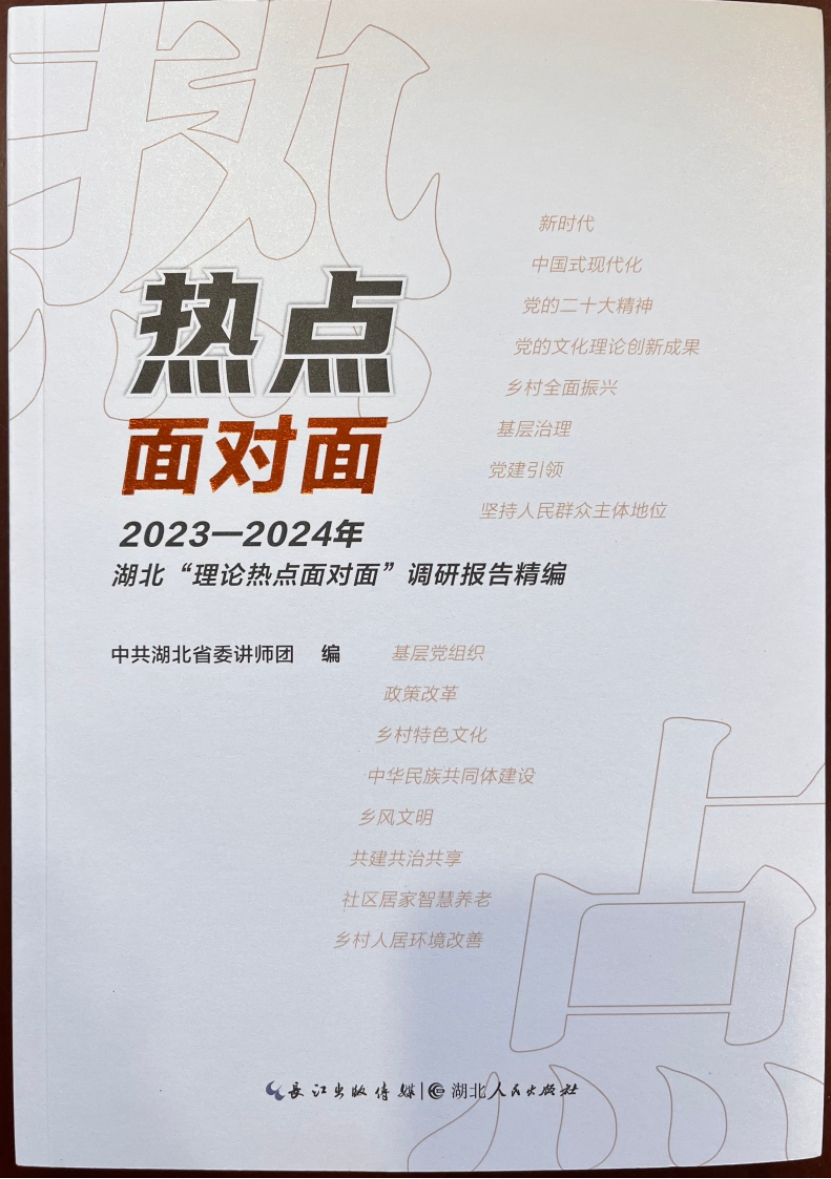 (文:方垚、马保青)近日,中共湖北省委讲师团出版《热点面对面:2023—2024年湖北“理论热点面对面”调研报告精编》一书,该书由长江出版传媒集团编印、湖北人民出版社出版。德赢官网vwin德赢ac米兰官方网马保青调研团队所著《以基层共同治理推动乡村治理现代化——基于竹山县10个试点的调查》和方垚调研团队所著的《乡村特色文化的传承、发展与展望——基于竹山县的调查》两篇调研报告被收录其中。两篇调研报告分别于2023、2024年获得湖北省社科基金后期资助“理论热点面对面”专项立项,为其资助研究成果。